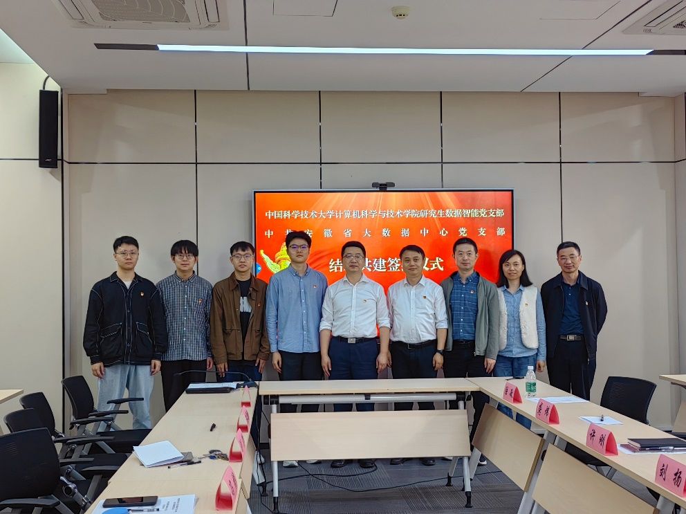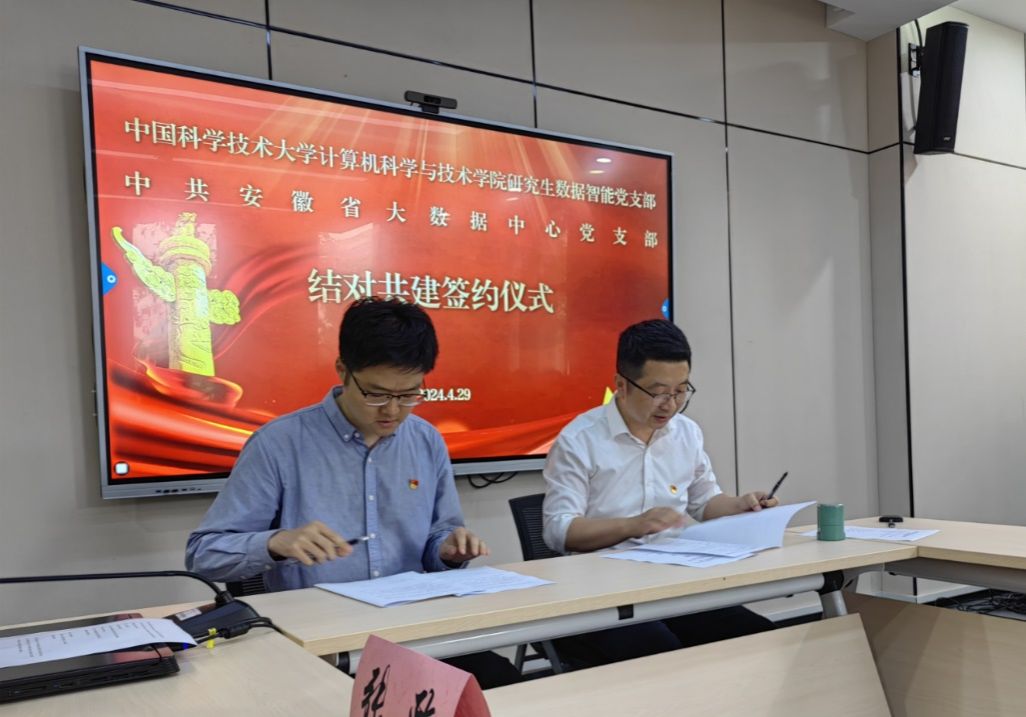 为深入贯彻落实党的二十大精神、充分发挥党建核心引领作用,加强组织联建、党员互动、活动互联、资源共享,4月29日下午,计算机科学与技术学院研究生数据智能党支部与安徽省大数据中心党支部在图书馆321会议室举行共建签约仪式。安徽省大数据中心党支部书记许刚主任、研究生数据智能党支部书记冯彬、院党委委员刘淇教授、院党务秘书任开新出席本次会议。会议由研究生数据智能党支部副书记郑凯主持。