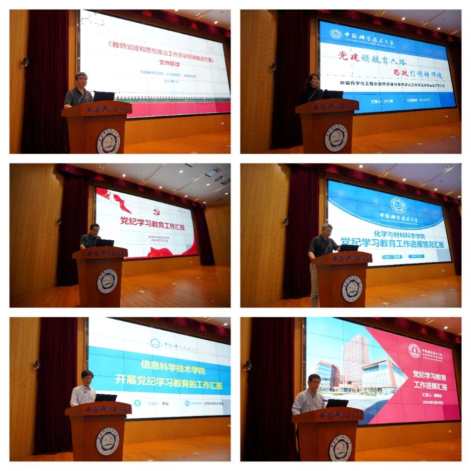 党委教师工作部、人力资源部部长陈卫东、环境科学与工程系党总支书记张文真作教师党建和思想政治工作有关报告。在党纪学习教育推进情况专题报告中,数学科学学院党委书记左达峰、化学与材料科学学院党委书记闫立峰、信息科学技术学院党委书记李斌、生命科学与医学部党委常务副书记臧建业先后作经验分享报告。