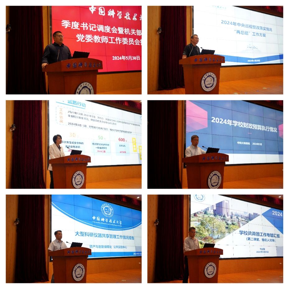 国际合作与交流部副部长、港澳台办公室副主任王晨通报了2023年度出国境相关案例;党政办公室主任、机关党委常务副书记、网络安全和信息化办公室主任王伟报告2024年中央巡视整改落实情况“再总结”工作方案 ;党政办公室副主任、网络安全和信息化办公室常务副主任彭慧作网络安全工作汇报;财务处处长姚子龙作2024年学校预算执行情况汇报 ;资产与后勤保障处处长赵钢作大型科研仪器共享管理工作情况报告;校团委书记千坤汇报了学校近期共青团相关工作。