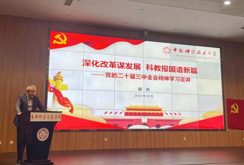 10月23日下午,中国科学技术大学学习贯彻党的二十届三中全会精神宣讲团成员、党委常委、校长助理薛天在生物楼一楼学术报告厅作党的二十届三中全会精神宣讲报告。校党委委员、工程科学学院执行院长吴恒安主持报告会。