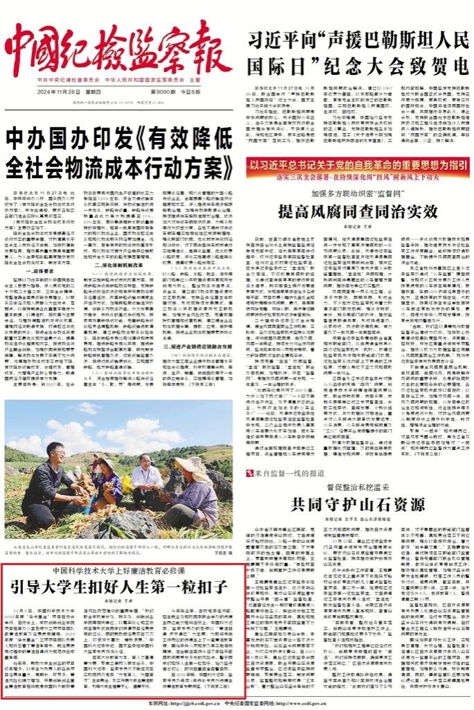 聚焦“为党育人、为国育才”,校纪检监察机构会同党委学生工作部、党委组织部、校团委、马克思主义学院、创新创业学院等有关单位,不断压紧压实各级党组织主体责任,扎实开展大学生廉洁教育,引导大学生育廉于心、倡廉于行。近日,《中国纪检监察报》在头版以《中国科学技术大学上好廉洁教育必修课 引导大学生扣好人生第一粒扣子》为题,刊发报道我校相关工作。