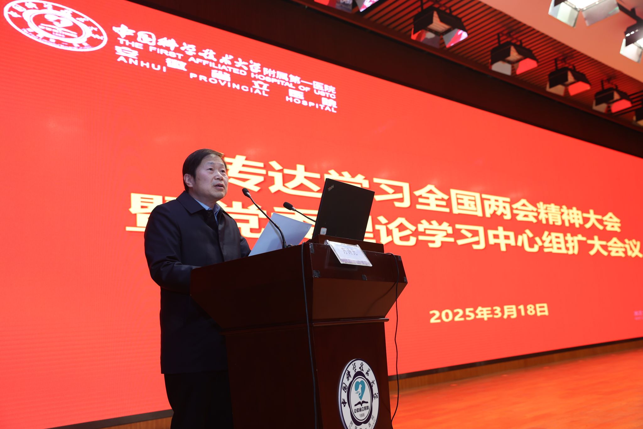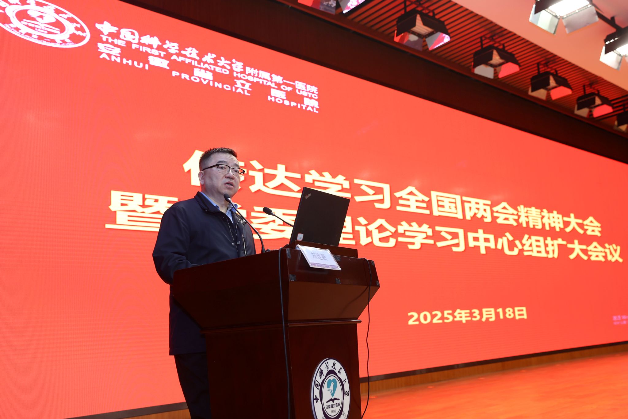 会议强调,要按照省委、大学部署要求,把学习贯彻习近平总书记重要讲话和全国两会精神作为当前和今后一个时期的重大政治任务。一要提高站位,深刻领会两会精神要义。把学习贯彻习近平总书记重要讲话和全国两会精神与学习贯彻习近平新时代中国特色社会主义思想和党的二十大精神结合起来,与学习习近平总书记考察安徽重要讲话精神和关于中国科大系列重要指示精神结合起来,一体学习领悟、谋划部署、贯彻落实,推动两会精神在医院落地生根、开花结果。二要抢抓机遇,以创新驱动高质量一体化发展。充分谋划好医院和学科高质量发展的目标和实施举措,完善人才引育机制,推动科技创新,深化医教研协同发展,努力打造全国一流高水平医院。三要敢于争先,持续提升医疗服务能力。聚焦心脑血管疾病、恶性肿瘤、罕见病等,持续提升疑难重症诊疗能力,形成一批具有国内领先水平的诊疗技术和医学研究品牌。以临床需要和患者需求为导向,持续深化人工智能场景应用研发,推进“智慧医疗、智慧管理、智慧服务”三位一体智慧医院建设。四要党建引领,为医院发展提供坚实政治保障。深入推动党建业务深度融合,强化党风廉政建设,统筹抓好“十五五”规划谋划工作,营造“想干事、能干事、干成事、不出事”的政治生态,保障医院平稳、高效、可持续运行。