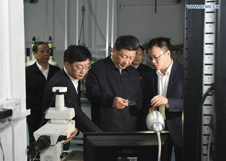 Chinese President Xi Jinping visits the Spin Magnetic Resonance Laboratory at University of Science and Technology of China in Hefei, east China's Anhui Province, April 26, 2016. Xi made an inspection tour in Anhui from April 24 to 27. (Xinhua/Li Xueren)