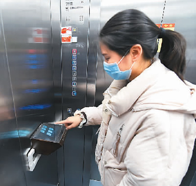 在中国科学技术大学附属第一医院,乘客用“无接触电梯按钮”操作电梯。周牧 摄(新华社发)