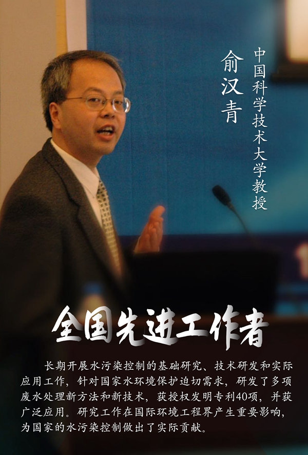 俞汉青,中国科学技术大学教授、国家杰出青年基金获得者、教育部长江学者特聘教授。他爱党、爱国,热爱科教事业,品学兼优。他治学严谨,工作勤奋,学术上勇于创新,研究工作在国际环境工程界产生重要影响,为国家的水污染控制做出了实际贡献,是政治思想素质好、学风端正、科研业绩突出和具有重要学术影响力的模范教师和优秀科学家。