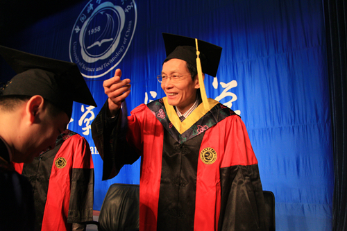 侯建国校长以学长和朋友的身份与毕业生进行了一场真诚的谈话。侯校长首先谈到,我校“中科院人才计划”陈秀雄教授、孙崧博士和英国数学家唐纳森合作,于今年5月成功破解了第一陈类为正时的 “丘成桐猜想”,给出了卡勒—爱因斯坦度量存在性之“丘成桐猜想”的完整证明。这一研究成果在国际上引起了强烈反响,标志着卡勒几何的研究达到一个全新的高度。陈秀雄是著名几何学家卡拉比教授培养的最后一位博士,而孙崧又是陈秀雄教授的博士研究生,三代师生、两代科大人,半个世纪的科研接力,充分体现了 “脚踏实地、持之以恒”。他希望大家在未来工作中,继承和弘扬科大人追求卓越的信念和永不服输的精神,坚持脚踏实地、一步一个脚印,努力成就一番事业。