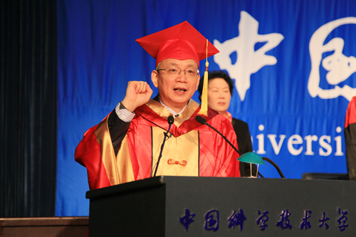 在侯建国校长的带领下,全体毕业生庄严宣誓:“感恩父母养育,感谢导师教诲,不忘母校培养。我们坚守母校信念,热爱科学、崇尚真理;我们传承母校精神,科教报国、追求卓越。我们用激情和智慧建设祖国,用责任和行动回馈社会,用成就和硕果回报母校!”