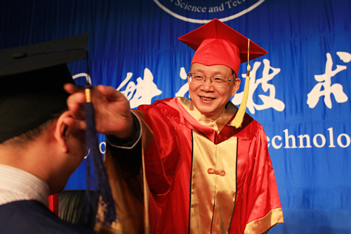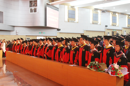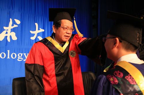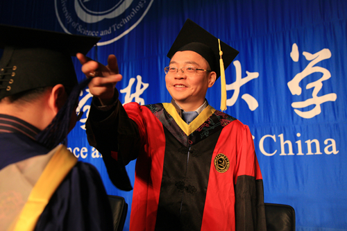 校领导许武、侯建国、蒋一,部分学院、国家重点实验室领导陈旸、汪毓明、陈华平、余玉刚、张和平以及导师代表曾建雄身着导师服在主席台就座。毕业典礼由张淑林副校长主持。