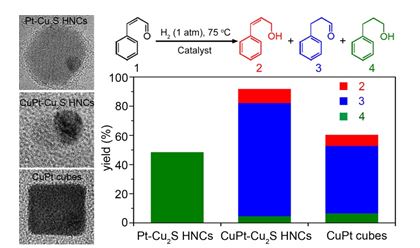 半导体与贵金属形成的复合纳米材料不仅兼具半导体和贵金属材料各自的本征特性,而且还具有因两者间的界面和交错的能带结构而产生的单独组分所不具备的特征和功能。曾杰教授课题组基于特色的可控制备手段,从晶体生长的基本理论出发,通过选择具有不同还原电势的Pt的前驱体以及含硫配体,调节Pt与Cu的相对还原顺序,制备出具有不同形貌以及不同元素分布的金属-硫化物异质结构纳米晶,为制备金属-半导体异质结构纳米晶提供了简单快捷的方法。此外,研究人员还深入探究了Pt-Cu2S、CuPt和CuPt-Cu2S在肉桂醛加氢反应中的催化性能。通过对CuPt和CuPt-Cu2S催化产物的对比,发现使用CuPt-Cu2S的反应有更高的转化率,这表明催化剂的界面效应有助于提高催化剂的活性。而通过对比Pt-Cu2S和CuPt-Cu2S的催化产物,Pt-Cu2S只生成苯丙醇,CuPt-Cu2S可以生成更多的氢化肉桂醛,这一现象表明合金的协同效应对提高催化剂的选择性有着重要作用。该研究通过调控催化剂的空间构型和组分分布实现了对催化剂性能的调控,对设计和开发实用高效的纳米催化剂具有指导意义。