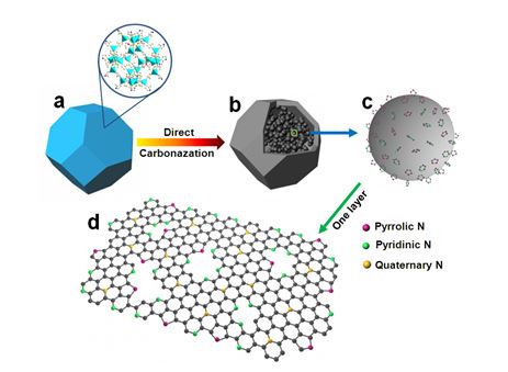 (a) ZIF-8。 (b) 富氮碳多面体(含大量类石墨烯粒子)。(c) 一个放大的类石墨烯粒子,边缘氮掺杂。(d) 一层石墨烯的边缘和晶格里三种氮结合构型。