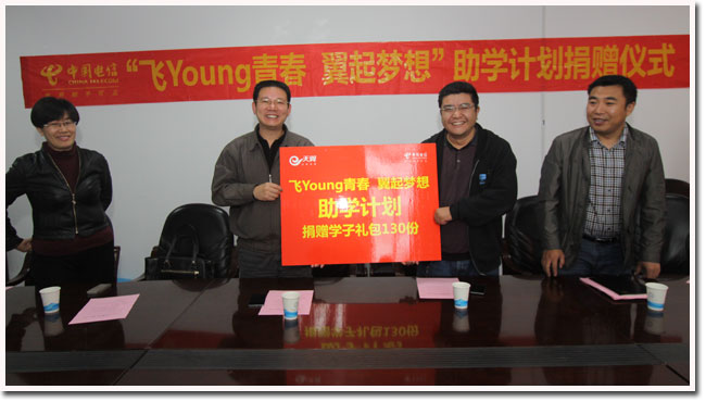 随后,中国电信公司启动“飞Young青春 翼起梦想”助学计划,现场向我校130名特困生每人捐助1台海信E260T+手机和一年话费,本地匹配20元云卡(含50元话费),并按规则受理分月返还话费。