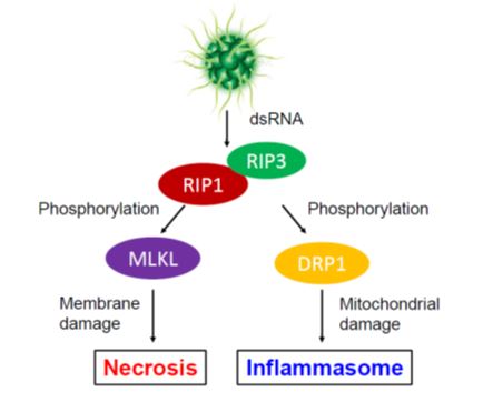 天然免疫系统及其诱导的炎症反应是机体抵抗病毒感染的重要手段,机体依靠天然免疫和炎症反应清除病毒感染。但另一方面,炎症反应过度活化或者持续存在又是病毒感染引起器官和组织损伤的重要原因。近年来的研究表明,病毒感染引起的炎症小体活化是机体产生天然免疫炎症反应的重要原因,但是病毒活化炎症小体的分子机制一直不清楚。该项工作中研究人员发现抑制坏死小体蛋白RIP1或者RIP3能够显著抑制包括流感病毒在内的RNA病毒活化的炎症小体活化,但并不影响DNA病毒活化的炎症小体。进一步的实验表明,RNA病毒感染能够促进巨噬细胞中形成RIP1-RIP3复合物,该蛋白复合物进一步通过DRP1诱导线粒体损伤,从而活化炎症小体。最后,研究人员发现在RIP3缺陷小鼠中,RNA病毒感染导致的炎症反应也大幅削弱。这些研究结果表明RIP1-RIP3蛋白复合物及其下游信号通路在RNA病毒活化NLRP3炎症小体过程中起关键作用,不仅揭示了RNA病毒诱发免疫炎症的机制,也为病毒感染相关炎症性疾病的治疗提供了潜在的治疗靶点。