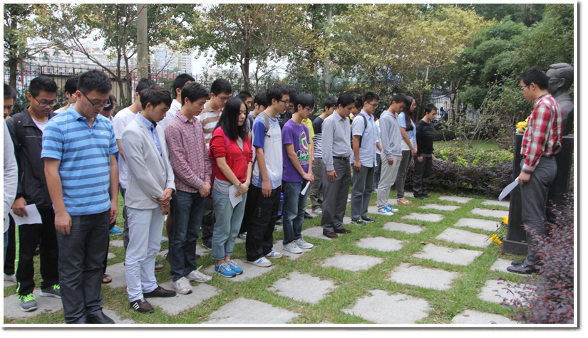 活动中,主持人详细介绍了郭永怀先生的生平事迹,参加活动的师生手捧秋菊认真聆听,不禁为郭先生科教报国的事迹而感动,为郭先生取得的科学硕果而自豪。随后,师生们在主持人的引导下,依次献上鲜花,并集体默哀三分钟。默哀结束后,同学们合唱了科大校歌《永恒的东风》。该活动不仅缅怀了烈士的丰功伟绩,还进一步弘扬了爱国、敬业的精神,激发了青年学子科教报国、复兴中华的精神动力,是对参与师生的一次灵魂洗涤。在首个烈士纪念日缅怀先烈是我校“社会主义核心价值观主题宣传月”的收尾项目,与月初展现郭永怀事迹的音乐剧《爱在天际》的演出遥相呼应。