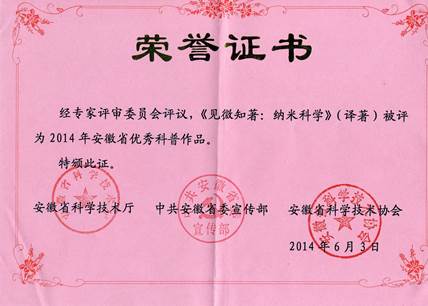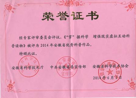 近日,由安徽省科技厅、安徽省委宣传部和安徽省科协组织的2014年安徽省优秀科普图书评选结束,共评出13部优秀科普作品,我校推荐的人文与社会科学学院张燕翔老师团队原创开发及创作的《“掌”握科学 增强现实虚拟互动科普读物》和合肥微尺度国家实验室曾杰老师等人的译著《见微知著:纳米科学》榜上有名。