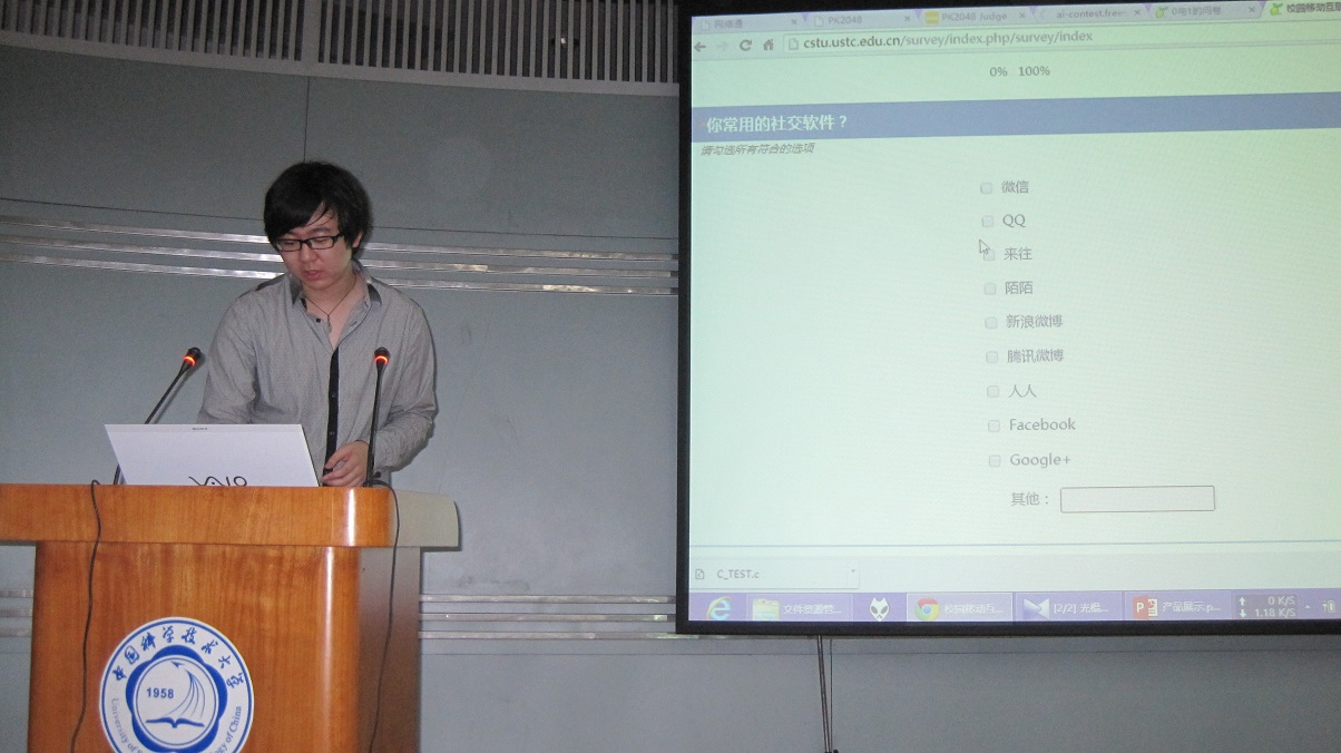 随后,主持人周宇老师揭开了当晚第二件作品——在线数据调研平台。该平台作为一种线上问卷调查系统,用线上网络问卷的形式替代了传统的线下纸质问卷,既大大减少了问卷调查发布和统计的工作量,又能够根据需要,快捷方便的反馈统计数据,输出多种可视化图表,极大的提高了调查问卷准确性和时效性。之后现场随即启动了一份关于校园网络的问卷调查,让到场的观众体验了问卷平台多项功能。