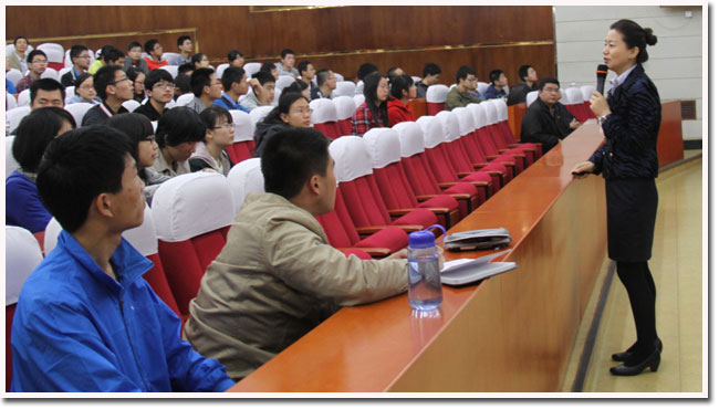 首次培训主讲老师由中国科大MBA客座讲师、南京大学商学院客座讲师、国际职业培训师行业协会培训师、2009年度全国百佳管理培训师周锐镝担任。她以“青春飞扬,从理到‘礼’”为题,希望同学们发挥高智商的优势,表达内心的爱、善和宽容,不断提高情商,培养“魅商”,提升人格魅力,用温暖的语言和体贴的行为工作、生活。课堂上,周锐镝用生活和工作中的实例,运用角色扮演的教学形式,演绎了为什么要学习礼仪,并就专业素养中的道德、态度、能力、形象和团队意识进行了介绍,就形象、仪表、交谈、现场等基本礼仪做了示范讲解,教学时课堂气氛活跃,学生积极参与,互动性极强,让同学们在模拟练习中体会感悟,效果良好。