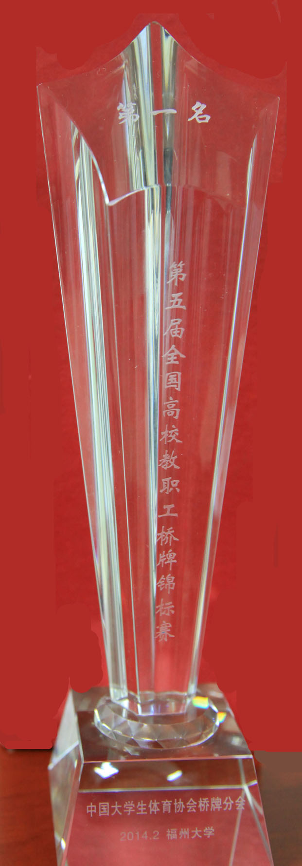 2月8日至12日,第五届全国高校教职工桥牌锦标赛在福州大学举行。首次参赛的我校教工桥牌代表队奋力拼搏,勇夺团体冠军。本次比赛由中国大学生体育协会桥牌分会主办,福州大学工会承办。教育部学生体育协会联合秘书处副秘书长、中国大学生体育协会专职副主席张燕军,福建省教育工委副书记、教育厅副厅长刘剑津等出席开幕式。