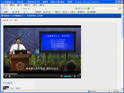 《人体健康的卫士:免疫系统》是我校2013年申报教育部精品视频公开课的3门课程之一。这是继汪志勇教授主讲的《化学与日常生活中的安全》课程和高琛教授主讲的《生活中的光学》课程之后第三门上线的课程。至此,我校2013年申报教育部精品视频公开课的3门课程均已上线,继续保持了3年来我校拍摄制作的视频公开课100%的上线率。