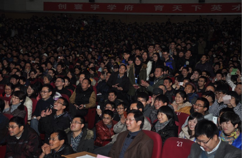 12月22日下午,著名学者易中天应邀在中国科学技术大学东区大礼堂作题为《历史的底牌》主题演讲,为了一睹易中天的风采,本能容纳1800人的大礼堂挤进3000多人,很多社会人士和其他高校的学生也慕名而来。本次活动由我校图书馆英才论坛主办,图书馆馆长助理宁劲主持。