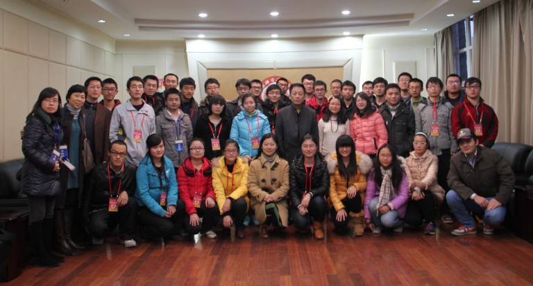 演讲结束后,易中天和图书馆学生志愿者合影留念。