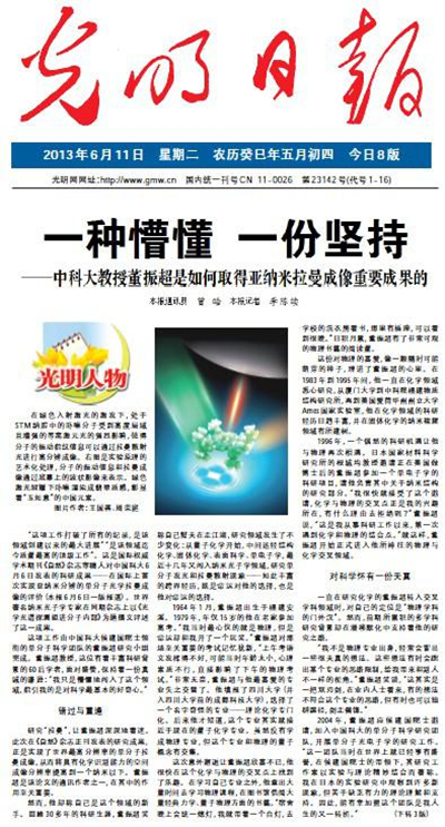 6月11日,《光明日报》头版头条以“一种懵懂 一份坚持——中科大教授董振超是如何取得亚纳米拉曼成像重要成果的”为题发表长篇通讯,从“错过与重逢”、“对科学怀有一份天真”、“团队要合作也要碰撞”三个方面讲述了董振超教授的科研之路。报道说,2004年,董振超加入了中国科大由侯建国院士领衔的单分子科学团队,他认为,中国科大宽松的学术环境和浓郁的科研氛围使他很多“天真”想法具备了不断尝试的空间,从而进行探索和开拓。谈到日前发表的最新成果时,董振超认为这是整个团队精诚协作的结果。