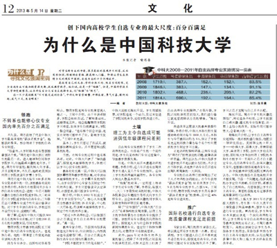 5月14日,《人民日报》第12 版头条位置刊发了“创下国内高校学生自选专业的最大尺度:百分百满足——为什么是中国科技大学”为题的深度报道,介绍了中国科大本科生自主选择专业的做法、配套措施等,认为“这一不少高校眼里‘不可能完成的任务’,中科大却首尝螃蟹、冲锋在前。勇气可嘉,底气十足。”