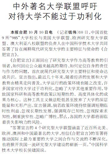 [文汇报]中外大学组织昨签署《合肥宣言》呼吁抵制功利化工具化 维护研究型大学的核心特质