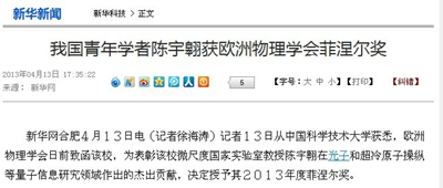 4月13日,新华社报道我校陈宇翱教授获2013年度欧洲物理学会菲涅尔奖。报道说,今年32岁的陈宇翱是我国近年来涌现出的优秀青年科技人才,他曾于1998年在第29届国际中学生物理奥林匹克竞赛中获得实验第一和总分第一,同年进入中科大深造。在校攻读本科和硕士学位期间,他开始进入量子信息科研领域,并合作搭建了世界上首个五光子纠缠实验平台,奠定了我国在多光子纠缠操纵方面的国际领先地位。