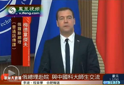 10月23日,凤凰卫视报道了俄罗斯总理梅德韦杰夫在中国科技大学发表演讲。报道说,梅德韦杰夫23日抵达安徽合肥,展开第二天的中国之行,此行也可以称作“科技之行”。在访问完中科院等离子体物理实验室后,梅德韦杰夫在中国科技大学与师生会面,并发表演讲。……作为总理和教授,梅德韦杰夫受到科大师生的欢迎,他也亲自抓起相机,记录了这一刻。在报告厅,他发表演讲,表述自己对当今大国关系的看法。该报道的视频点击量达197576次