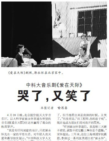 5月3日,《人民日报》科技视野专版以“中科大音乐剧《爱在天际》:哭了,又笑了”为题发表报道。报道说,“共和国的脊梁——科学大师名校宣传工程”首批演出剧目在京汇演,中国科大以“两弹元勋”郭永怀事迹为背景的音乐剧《爱在天际》的演出赢得了观众的热烈掌声。同时,《人民日报》还配发了“让科学精神直抵心灵”的评论文章,说“科学大师们虽然远去,但科学精神通过演出,变成一粒粒种子,根植于每位青年学子的心里。”