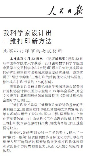 9月23日,《人民日报》报道了中国科大在三维打印领域取得重要研究进展,称中国科大成功实现了“经济节约型”三维打印的结构优化设计与验证,相比实心打印节省约70%的材料。