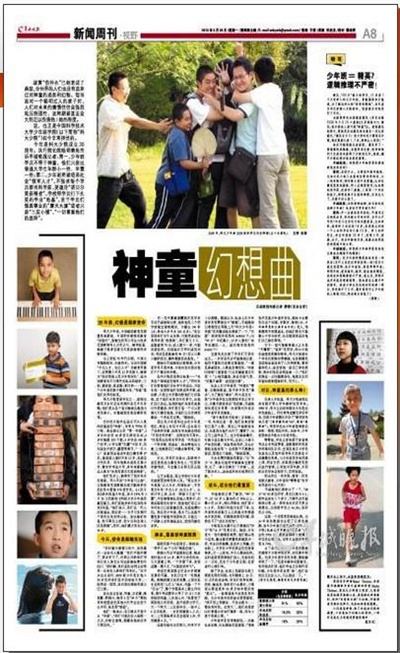 5月20号,《羊城晚报》以“神童幻想曲”为题发表专版报道。报道称,科大少年班,中国超前教育的摇篮和发源地、中国科学家精英教育“试验田”,曾被包括邓小平在内的多位国家领导人点名认可,被李政道、杨振宁等多位诺贝尔奖获得者科学家青睐。