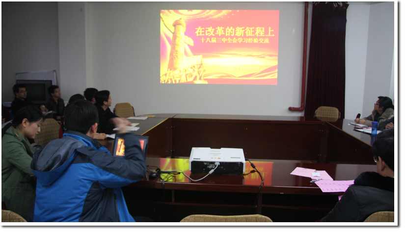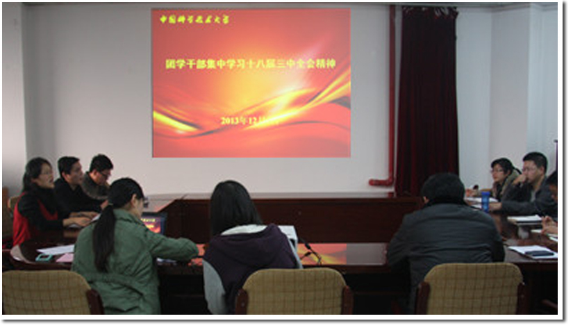 为贯彻落实校党委关于认真学习十八届三中全会精神的有关要求,12月4日下午,校团委组织召开了传达学习十八届三中全会精神专题会议,在我校团学系统中迅速启动了学习十八届三中全会精神行动。校团委全体老师,各学院团委(团总支)书记等参加了会议。