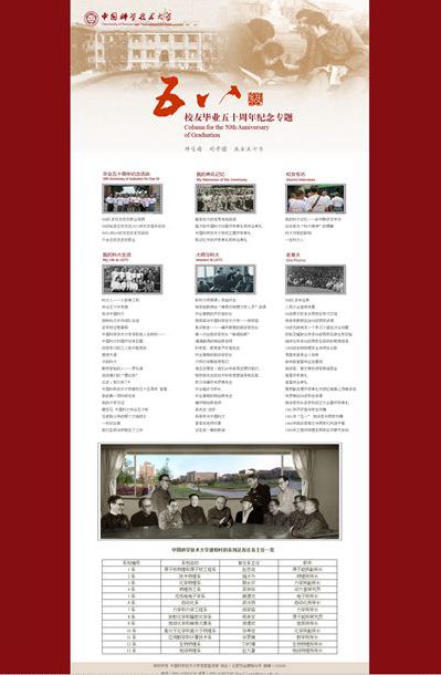 专题网页共设有“毕业五十周年纪念活动”、“我的典礼记忆”、“校友专访”、“我的科大生活”、“大师与科大”、“老照片”六个栏目。