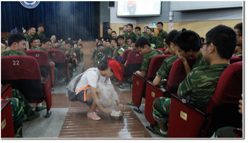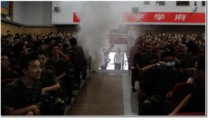 下午四点,演习活动正式开始。演习活动由点燃道具烟饼、切断照明电源、警报响起、人员有序疏散、清查现场、疏散区域集结、清点上报人数、总结点评等环节组成。参加演习的全体学生全部由礼堂安全撤离到达指定集结地点后,各营承训教官向军训团领导汇报了集结人数,对同学们进行了简单总结点评。