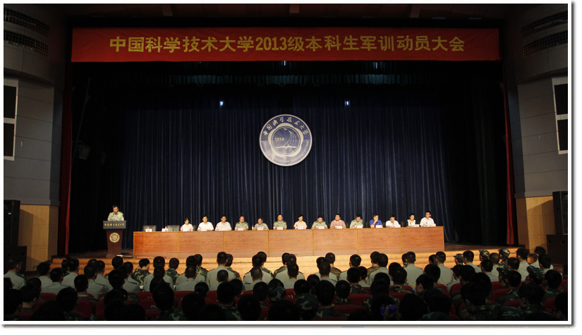 8月19日上午,中国科大2013级本科生军训动员大会在东区大礼堂召开。解放军电子工程学院院务部副部长王守永及二系、军务处等部门领导,中国科大党委副书记鹿明、副校长周先意,以及学工部、教务处、招生就业处、党委人武部、校团委等有关部门负责人和军训团领导出席会议,解放军电子工程学院70余名承训军官,全体2013级本科生班主任、辅导员和1849名本科生参加了军训动员大会。大会由党委人武部部长、军训团团长聂磊主持。