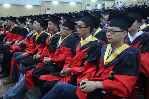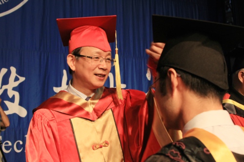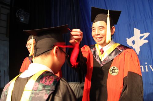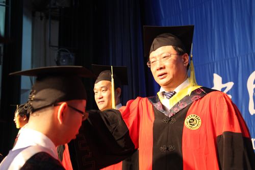 最后,在校歌的乐曲声中,同学们身着学位服依次走上主席台,校领导和导师代表们为他们一一扶正流苏。