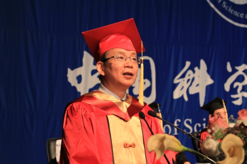 校学位委员会主任、校长侯建国在典礼上发表讲话。他首先代表学校对毕业生表示最热烈的祝贺。他指出,2013年对科大来说是值得纪念的一年,今年是学校建校55周年,是首批本科生毕业50周年,同时也是首批博士生毕业30周年。1978年,中国科大成立了新中国第一个研究生院,并率先建成了本、硕、博一体化的人才培养体系。30多年来,科大累计授予博士学位六千多人,累计授予硕士学位两万多人,如今这些硕士、博士都已成为各个领域的骨干力量和领军人才。在研究生生涯的几年时间里,同学们不仅圆满完成了学业,逐步成长为学校科研队伍中令人瞩目的生力军,还在丰富多彩的社会实践和公益活动中锻炼了自己的综合素质,母校为你们感到骄傲和自豪。