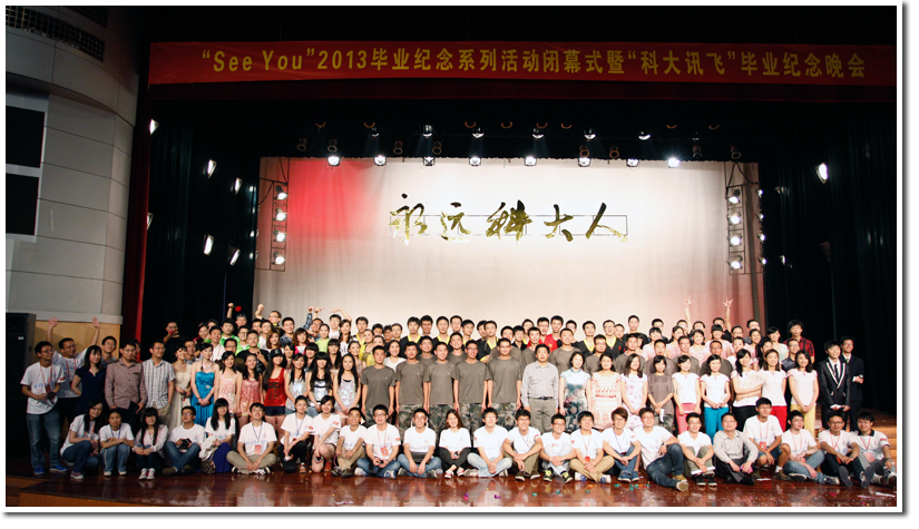 6月9日晚,主题为“永远科大人”的“See You”2013毕业纪念系列活动闭幕式暨“科大讯飞”毕业纪念晚会在东区大礼堂隆重举行。校党委副书记鹿明,机关有关部门负责人、各院系学工负责人和分团委团总支老师来到了晚会现场,与我校2013届毕业生共抒毕业情怀。