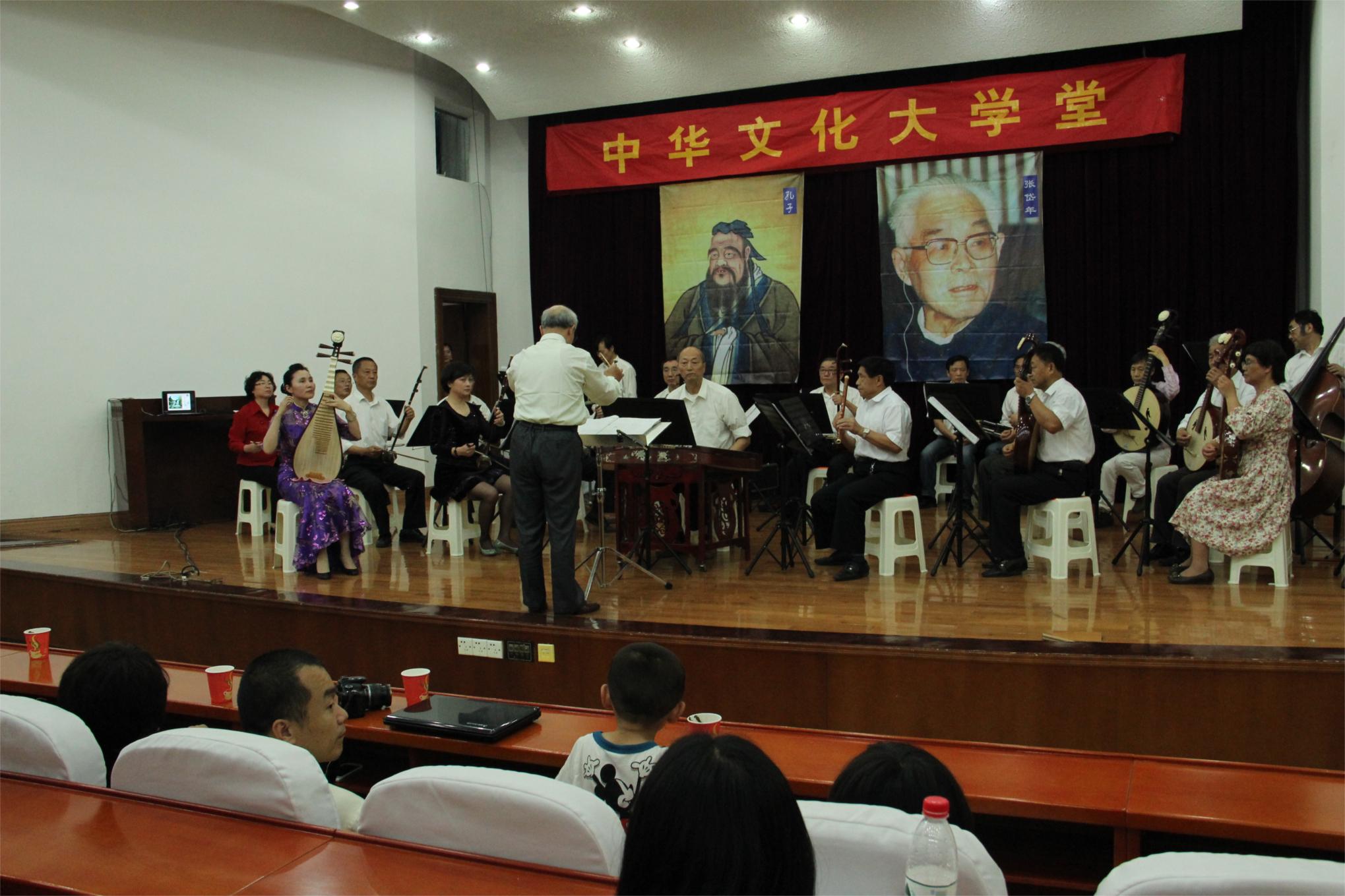 最后,在王玉团长的组织下,梦响民族乐团的倾情演出把本场讲学活动带入的优美意境。陈海昌先生指挥的曲目《欢歌笑语迎嘉宾》和《远方的客人请您留下来》,很好地传达了大学堂敞开胸怀欢迎和接纳来自四海的中华文化爱好者的气度。余文浩先生指挥的国乐经典《春江花月夜》,乐曲所描绘的意境深远,时而幽静,时而热烈,陶萍和李坤老师的琵琶和竹笛的演奏委婉、典雅、悠扬。最后一曲,《难忘今宵》,加上市歌舞团战裕民和赵小玲老师的演唱,令大家意犹未尽,共同期待下一次大学堂活动的早日到来。