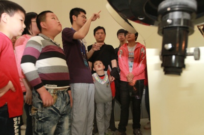 中科院星系宇宙学重点实验室科普点从上午一开放就吸引了大量的参观者。现场安排了天文科普走廊展板、古天文仪器展示,播放天文科普电影等。现场的志愿者郑学琛同学是来自天文系大三的学生,他参加科技活动周的志愿服务已经三年了。“楼上还有天文望远镜,天气好的时候,可以让参观者亲身体验观测!”郑学琛告诉记者,“我觉得科技活动周很有意义,看到这些中小学生对科技这么感兴趣,我也感到非常满足!”