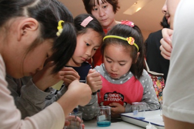 东区的化学与材料科学学院实验教学中心是今年新增的科普点之一。在这里,许多中学生和小朋友在实验演示大厅被化学实验的魅力深深的吸引。在化学实验操作台前,围满了跃跃欲试的小朋友,他们有的用感光液写字,有的在学习怎么做“琼脂果冻”,有的在学习做滴定实验……志愿者刘老师告诉新闻中心记者:“因为可以亲手操作,中小学生们都很感兴趣,有很高的参与热情。”