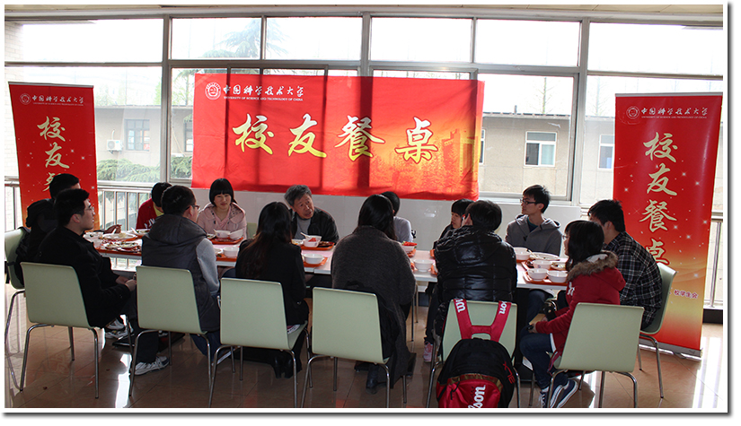 当日中午,黄吉虎老师还走进第二十七期“校友餐桌”,与十余名同学共进午餐,亲切交流,畅谈人生感悟,讲述他与中国科大的不解之缘。黄教授向大家讲述了他如何以数理化三门满分的高考成绩被清华大学录取后,又被刚刚成立的中国科大选中的经历。他说,正是钱学森先生的建议,才让他与中国的卫星、火箭事业结缘,并亲自参加了19次卫星的发射。谈到当年到酒泉参与第一次卫星发射时的艰苦条件,黄教授感慨颇深,勉励在座的同学们要刻苦学习。他说,青年时期的艰苦奋斗是将来人生成功的坚实基础。黄教授真挚、朴实的作风,热情豁达的人生态度感染了每一位同学,也加深了同学们对于科大精神的理解。
