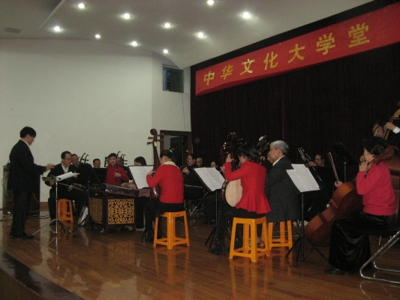 在中场的才艺展示环节,安徽梦响民乐团专程冒雨赶来,演出了三首经典民乐,包括乐器合奏、笛子独奏、演唱等。乐团成员多来自省市歌舞团专业演员,专业水平颇高。王玉团长和指挥陈海昌先生都是中华文化大学堂的学员,他们创意把国乐融入国学的课堂,让国学插上国乐的翅膀,让国乐沐浴哲理的灵光,使音乐的美滋润中华文化大学堂。在场听众修国学,听国乐,让梦想在实践中奏响,他们的精湛演出,受到全场热烈欢迎。