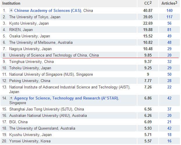 在这份最新的排名中,中国科学院在亚太地区科研机构排名中跃居第一,中国科大跃升至亚太区第8位,清华大学、北京大学、上海交大、深圳华大基因分列亚太区第9、12、15、17名。在中国高校中,中国科学技术大学自2012年度跃升榜首后,再次名列第一,清华大学、北京大学、上海交大、浙江大学(亚太区第23)、华中科大(亚太区第26)、复旦大学(亚太区第27)、香港大学(亚太区第41)、南京大学(亚太区第42)、厦门大学(亚太区第48)分列第2-10名。