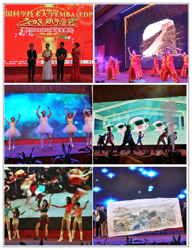 毕业典礼结束后,EMBA、EDP2013新年酒会拉开序幕。EMBA学员、安徽广播电视台主持人任良赟、罗冰、马滢和合肥广播电视台主持人刘漪等强大的主持阵容担任本次酒会的主持人。由EMBA学员、EDP学员共同呈现的丰富多彩的节目赢得了在场观众一次次热烈的掌声。学员们自编自导的舞蹈、歌曲、音乐剧、诗朗诵等节目,精彩纷呈。整台晚会分为“最炫科大风”、“积累正能量”、“科大好声音”三个篇章。其中超炫的电光舞《无极》、超人气的《江南Style》、充满喜剧色彩的《天鹅“闹”春》、激情无限的《wakwak热情无限》舞蹈等掀起了一个又一个的高潮。