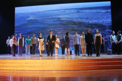 《爱在天际》的演员们一一向现场的观众谢幕,各位嘉宾和部分师生走上舞台,与剧组成员合影留念。