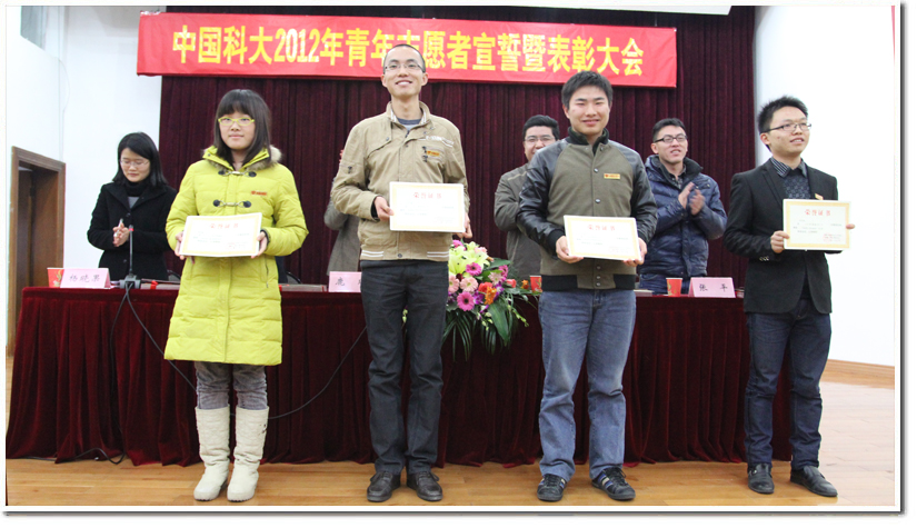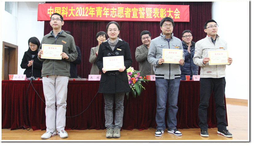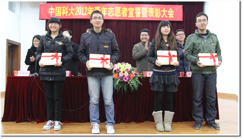 会上宣读了《关于表彰2012年度志愿服务先进个人的决定》,与会领导为我校2012年志愿服务先进个人代表颁奖。吴茂乾等8人荣获“中国青年志愿服务奖铜奖”,翟秋实等8人荣获“中国青年志愿服务奖奖章”,李晓红等94人荣获“优秀青年志愿者”荣誉称号。