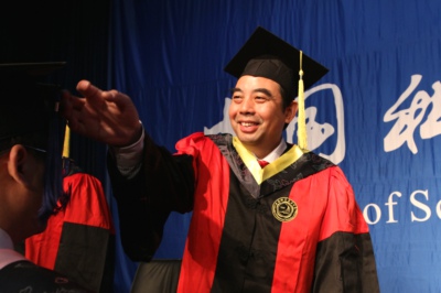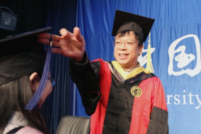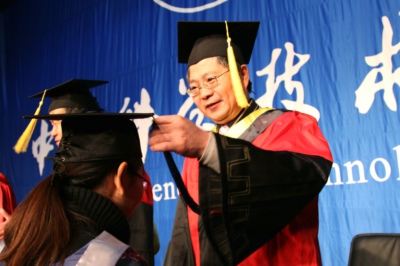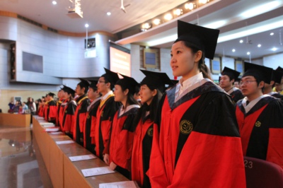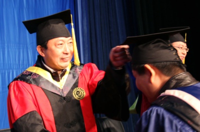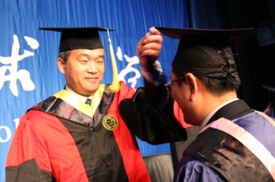 最后,在激扬豪迈的校歌旋律中,同学们身着学位服依次登上主席台,校领导和导师们为他们一一扶正流苏,合影留念。