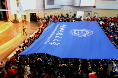 大会第一项议程是请出校旗。30名校旗护卫队同学高高举起一面巨幅校旗,从后排缓缓移向主席台,最后悬挂在主席台中央。校旗从同学们的头顶掠过,激起阵阵掌声和欢呼声。